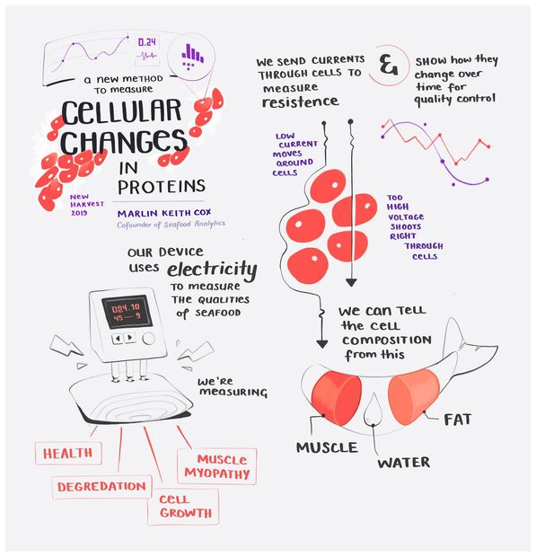 Early work at CQ Foods, Inc. included measuring the fat content of live Alaskan salmon as they ran up the river, without harming the fish. The innovation of using BIA to measure compositional components in fish that include fat, protein, water, dry, ash, and energy content, and relating these measures with the condition was a breakthrough in non-invasive animal health monitoring.